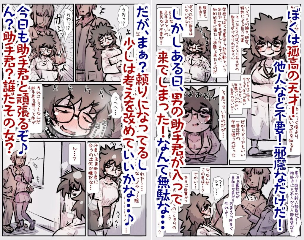 よくいる僕っ娘ボサ髪チビ巨乳博士と屈強な助手君のやつ