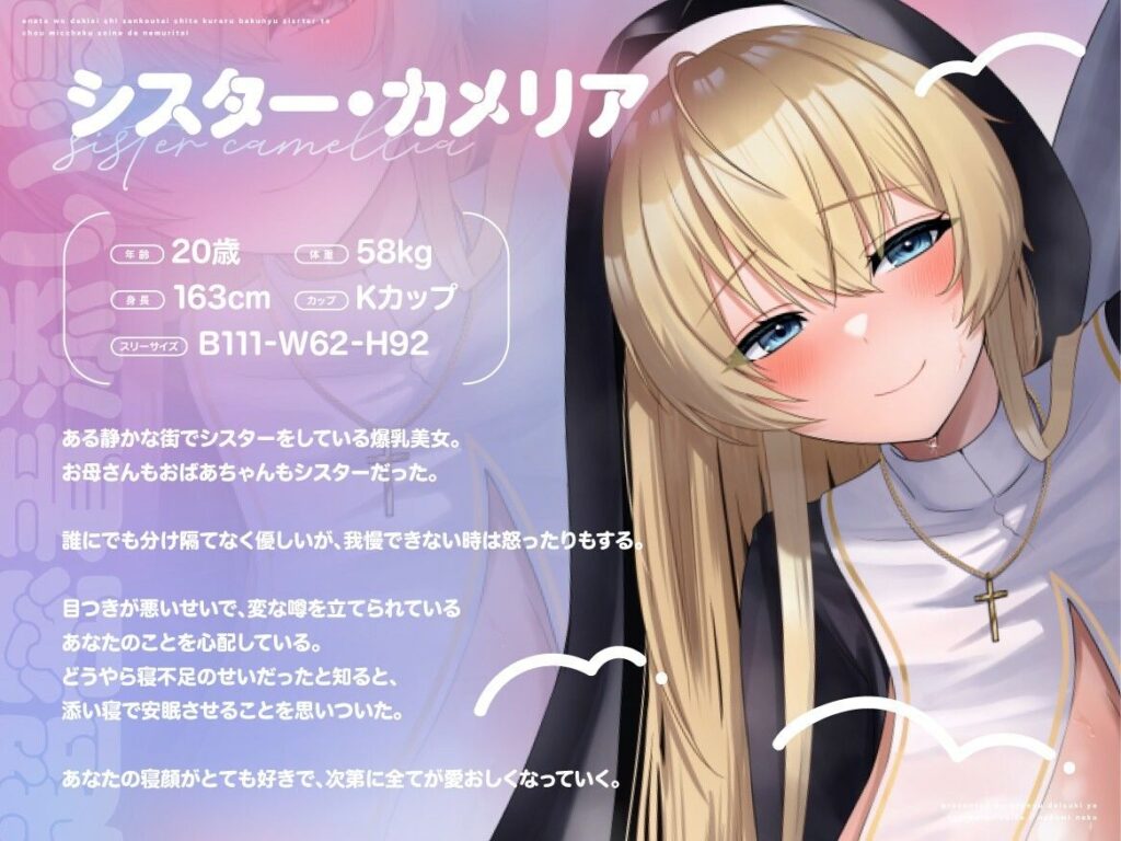今すぐ読む本編を読む【期間限定99円/1時間40分】あなたを溺愛し全肯定してくれる爆乳シスターと超密着添い寝で眠りたい【癒し/バイノーラル】品番: d_673993発売日: 2025年10月4日ボリューム: 8本 (約112分)+αジャンル: 処女、シスター、巨乳、中出し、フ... -